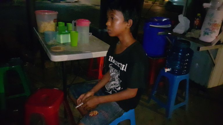 Il tredicenne Sandi Saputra lavora di notte in una bancarella di nasi goreng (riso fritto) a Palembang, la capitale del Sud Sumatra, e frequenta la scuola di giorno. Guadagna l’equivalente di 2,50 dollari a notte, la maggior parte dei quali li dà ai suoi genitori, ma ha un po’ di denaro residuo da spendere in sigarette.